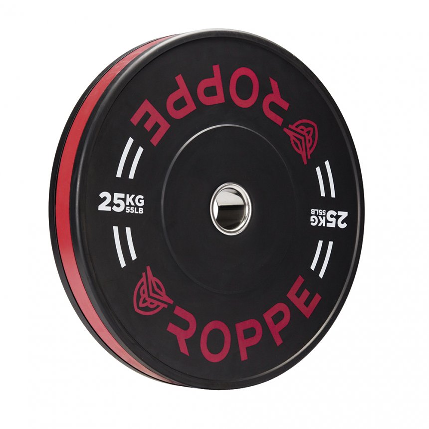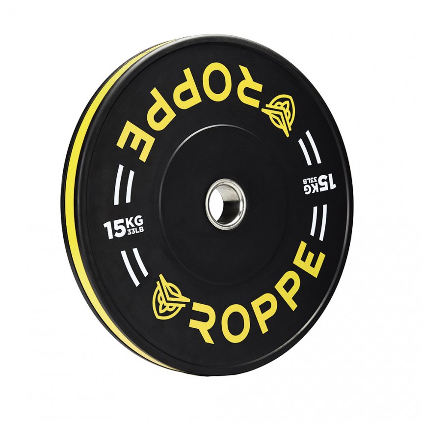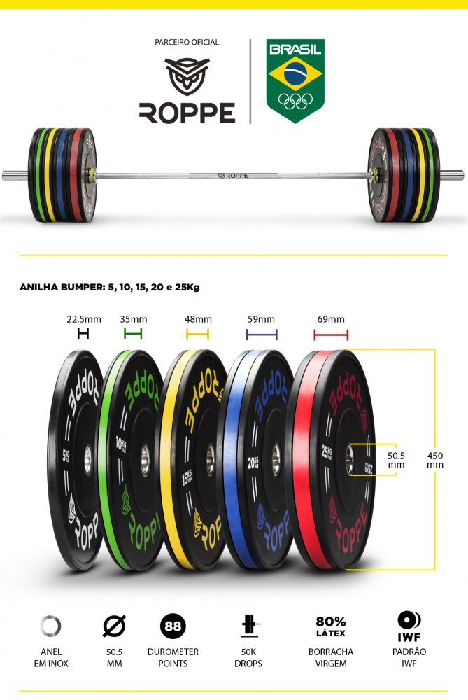 As anilhas são fabricadas no padrão de 450 mm de diâmetro, com superfícies em borracha virgem e uma abertura de 50.5+/-0.1mm. Testada na escala Shore A Durometer, a Anilha Bumper da Roppe marca uma pontuação de 88, tornando-a uma das principais anilhas olímpicas high-end da indústria. Com um design colorido respeitando as cores da IWF as anilhas da ROPPE o ajudam a construir aquele status para o seu espaço. O anel é produzido em aço inoxidável de 5cm. Realizados 50.000 testes de drops e tratamento de resistência à UV. Espessura de Variável conforme peso.