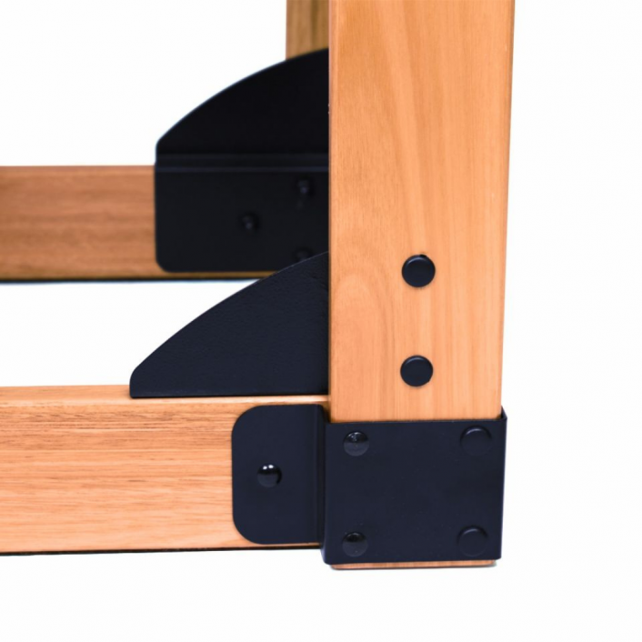 Além disso, é o único equipamento que possui chapas de aço reforçando a parte interna da base do aparelho, garantindo 100% de estabilidade, tornando-o muito mais resistente. Em sua parte frontal, conta com 5 degraus sendo a superior móvel, para possibilitar segurança nos exercícios de barriga para cima, de cabeça para baixo e os laterais.