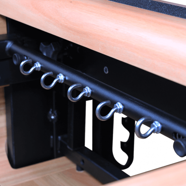 O REFORMER mais bonito do mercado permite que a barra de pés seja utlizada tanto na soleira, como na cabeceira do equipamento. O Stopper pode ser regulado na cabeceira do equipamento limitando o avanço do carro, proporcionando maior segurança. Duas molas podem ser engatadas na face frontal do carro, permitindo maior resistência no sentido inverso.