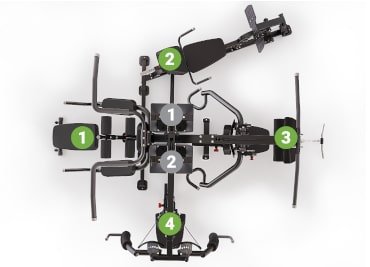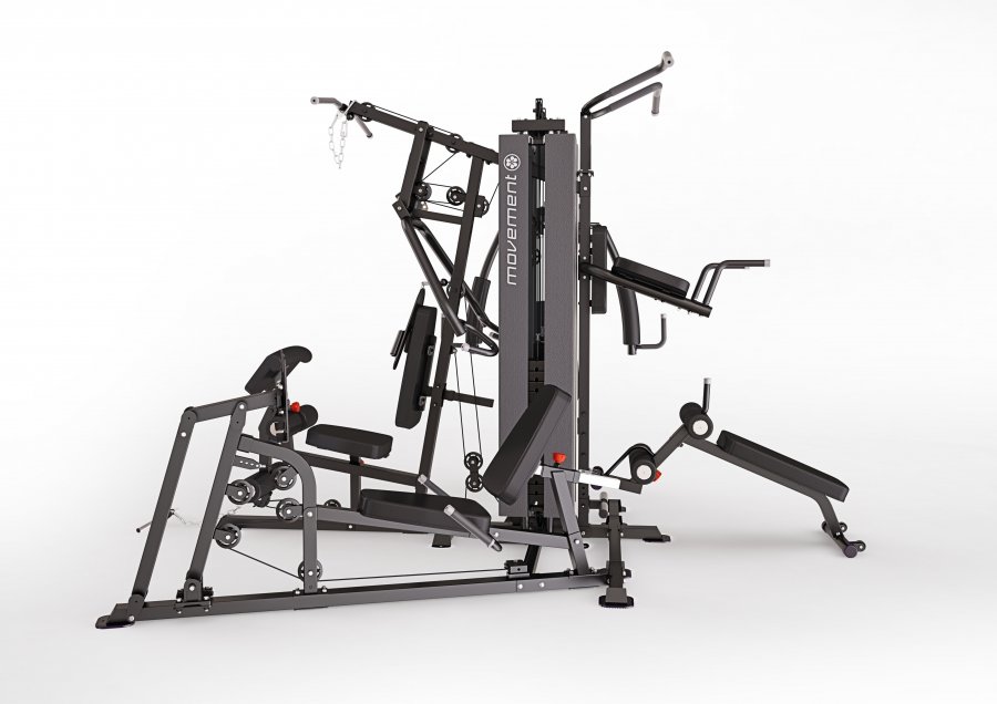 O W9 é um modelo com 4 estações e duas torres de peso que permitem mais de 30 exercícios para até três pessoas simultaneamente.