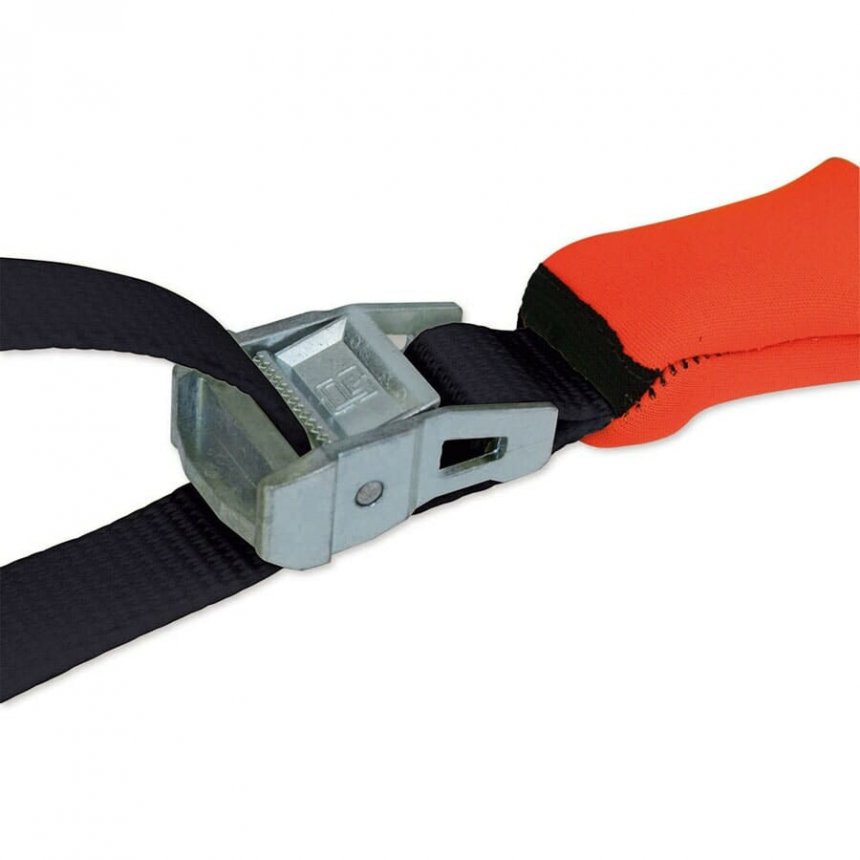 A fita é ajustável e desenvolvida em poliéster de alta tenacidade, suportando até 3000 quilos.