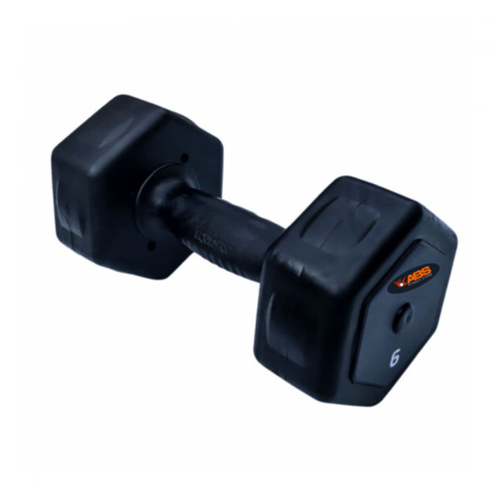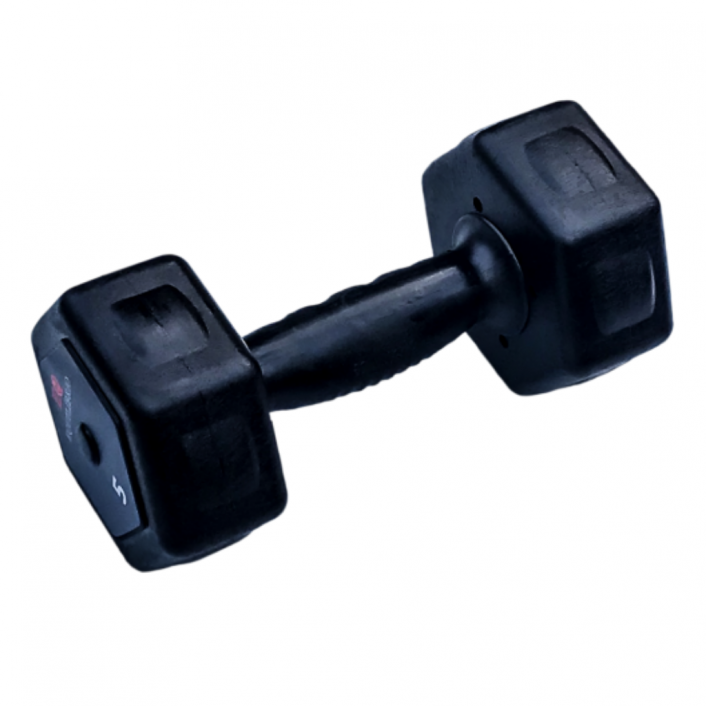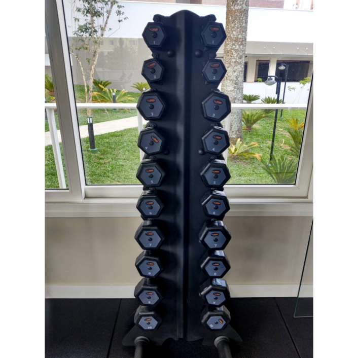 Conjunto de halteres sextavados recobertos por um material dúctil, resistente e flexível.