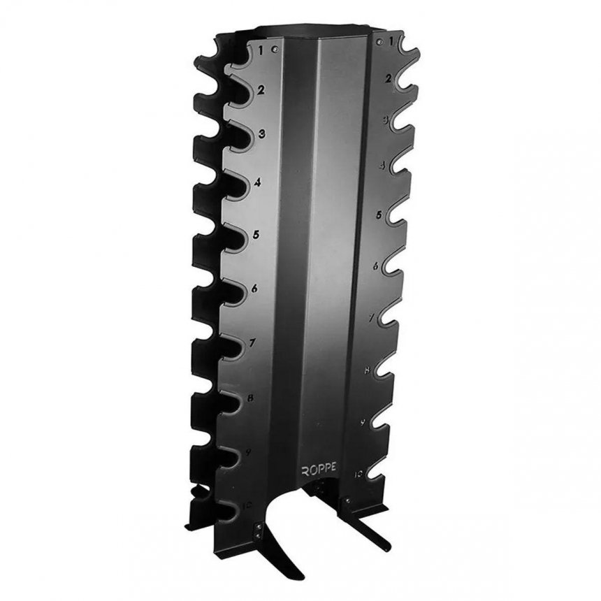O Rack da Roppe é compacto para armazenar kit com 10 pares de dumbbells/tribells.