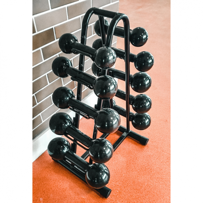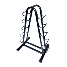 Tem suporte adequado para cinco pares de pesos e impede que você force a coluna ao erguer um deles do chão. É uma forma de evitar acidentes ou lesões e manter o ambiente em ordem.